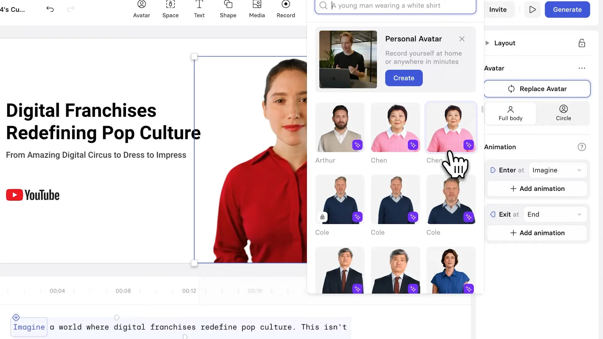 Once uploaded, Synthesia allows me to choose a video template. I like this particular presenter avatar because she matches YouTube’s branding.