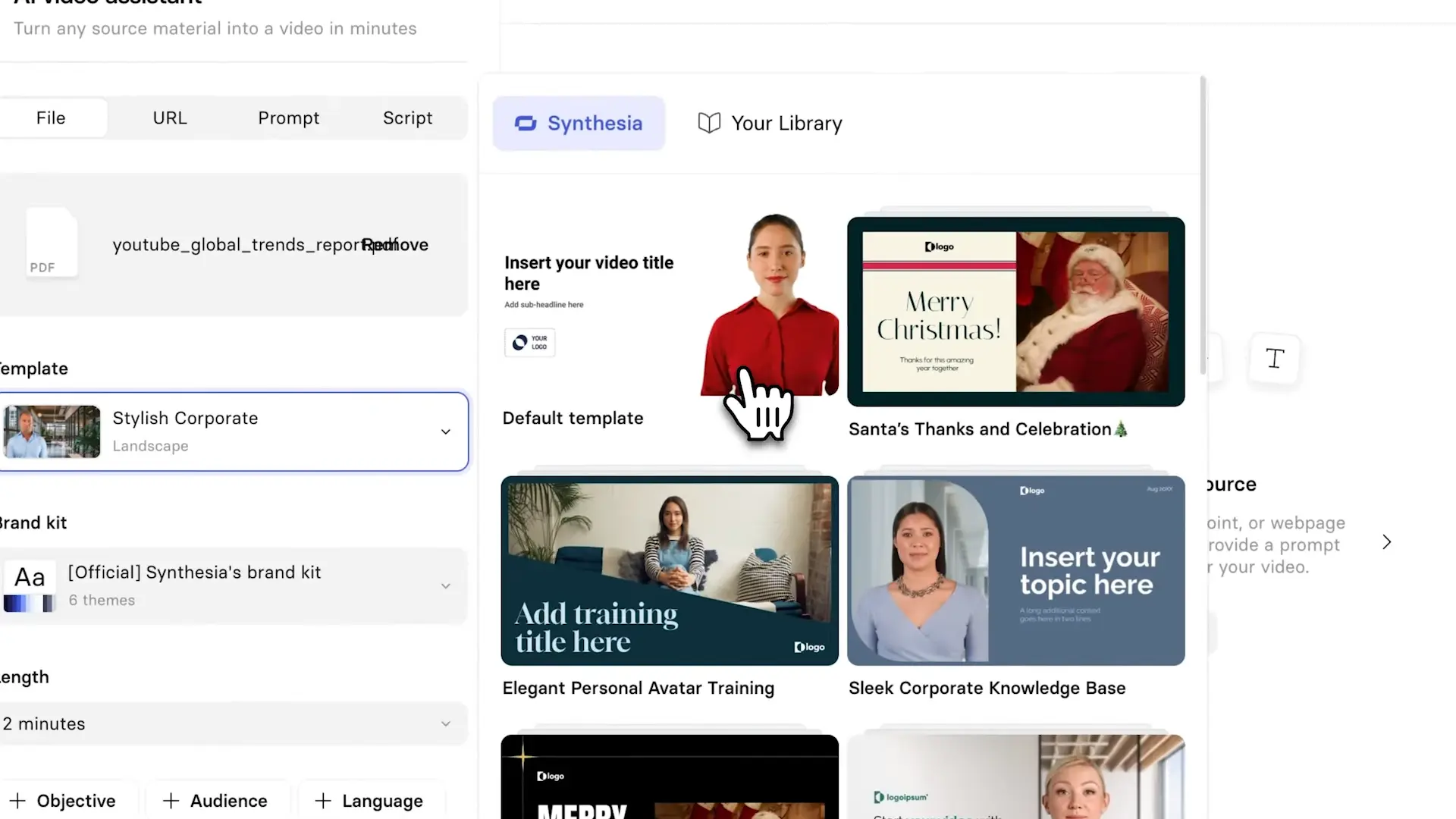 You can convert a PDF into a video using Synthesia’s AI Video Assistant. Simply upload your PDF, select a template, customize branding, and let AI generate a structured video with text, visuals, and a presenter in minutes.