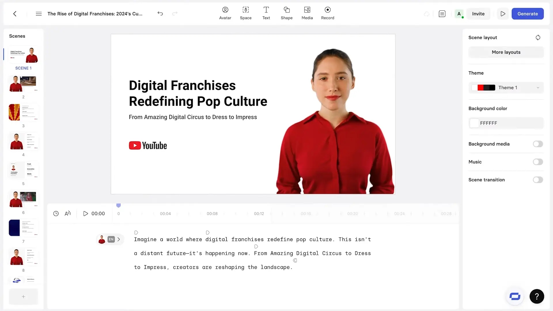 With Synthesia’s brand kit, I can make sure my video matches YouTube’s branding—using YouTube’s colors (red, white, black), logo, and preferred avatars.