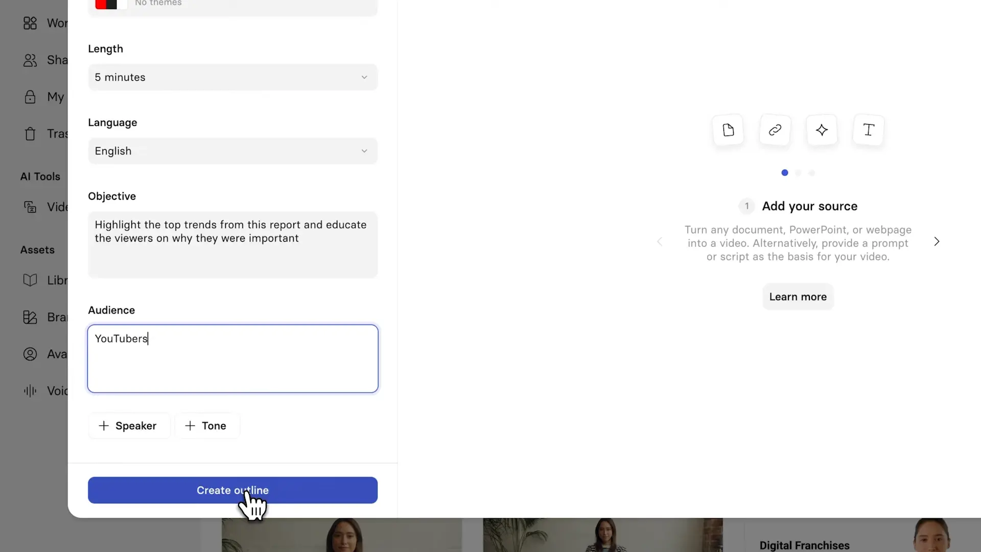 Now, we need to upload our PDF. You could also start from a blog post or a script, but in this case, I’m going to upload the YouTube Trends Report.