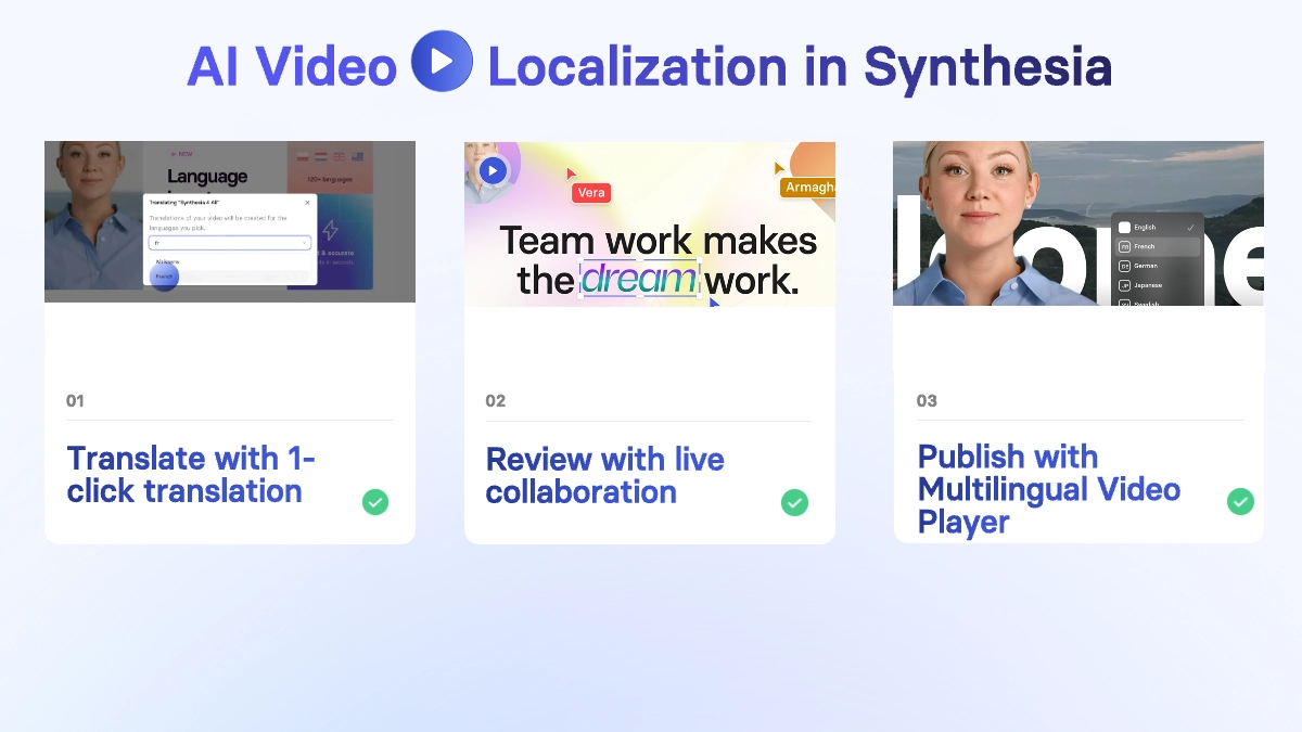 - 1-click Translation delivers instant, AI-powered translations of a video created in Synthesia, with easy-to-use versioning control and live collaboration.
