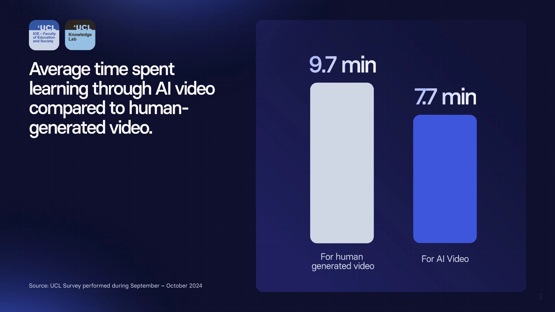 The UCL study found that there was a 20% drop in the average time spent on the training course when viewers watched the shorter length of AI-generated video compared to the human-created one, with no negative impact on the learning gains.